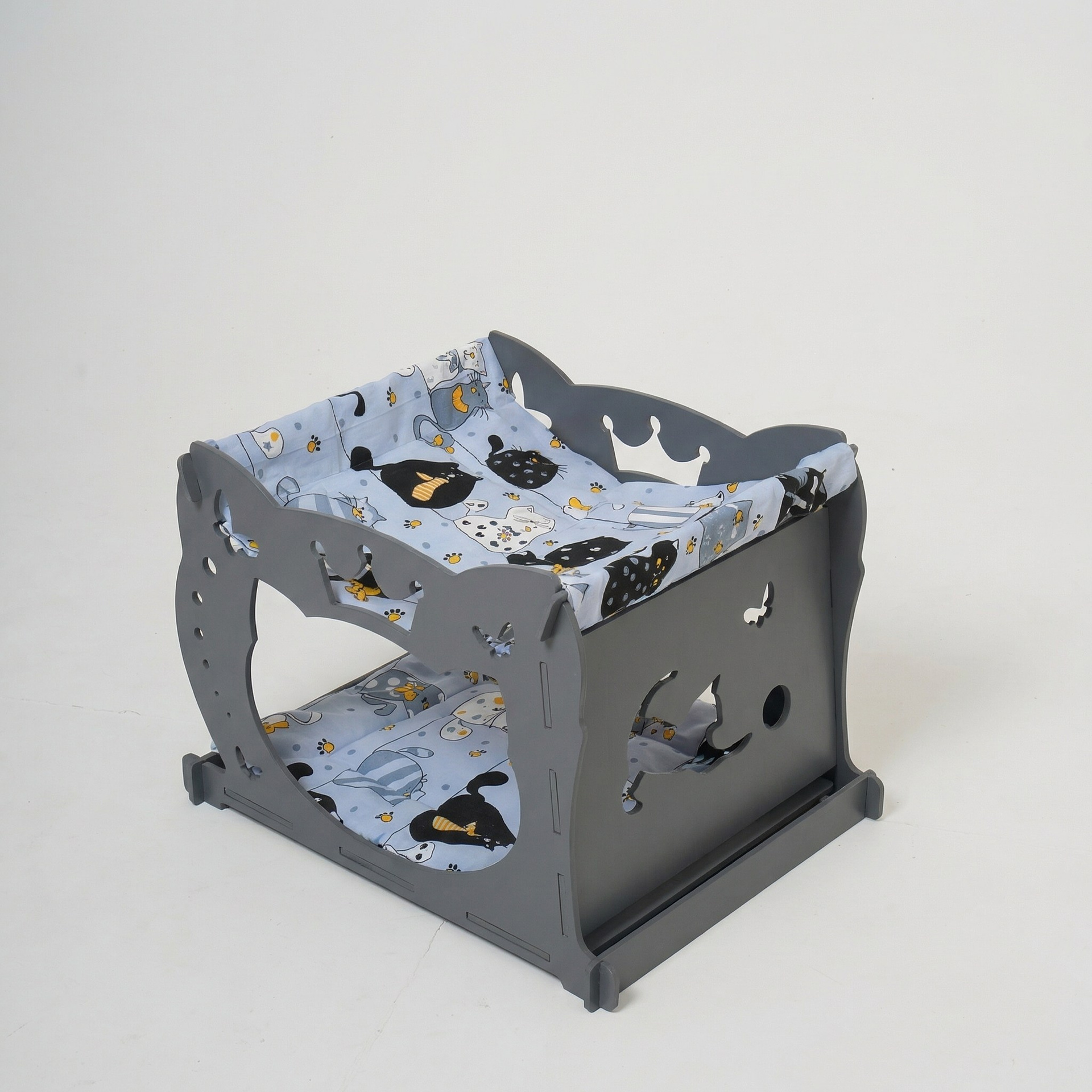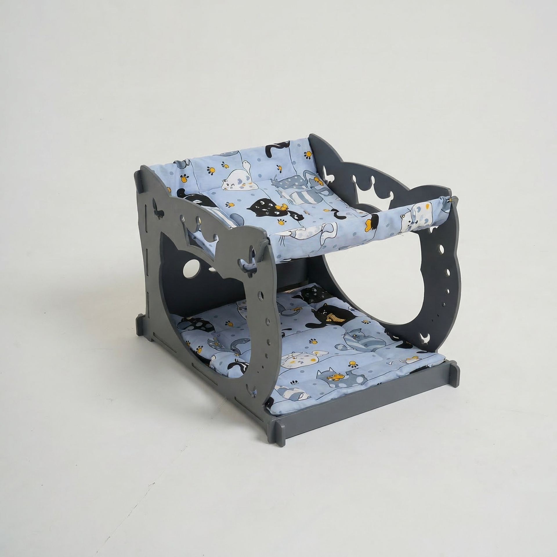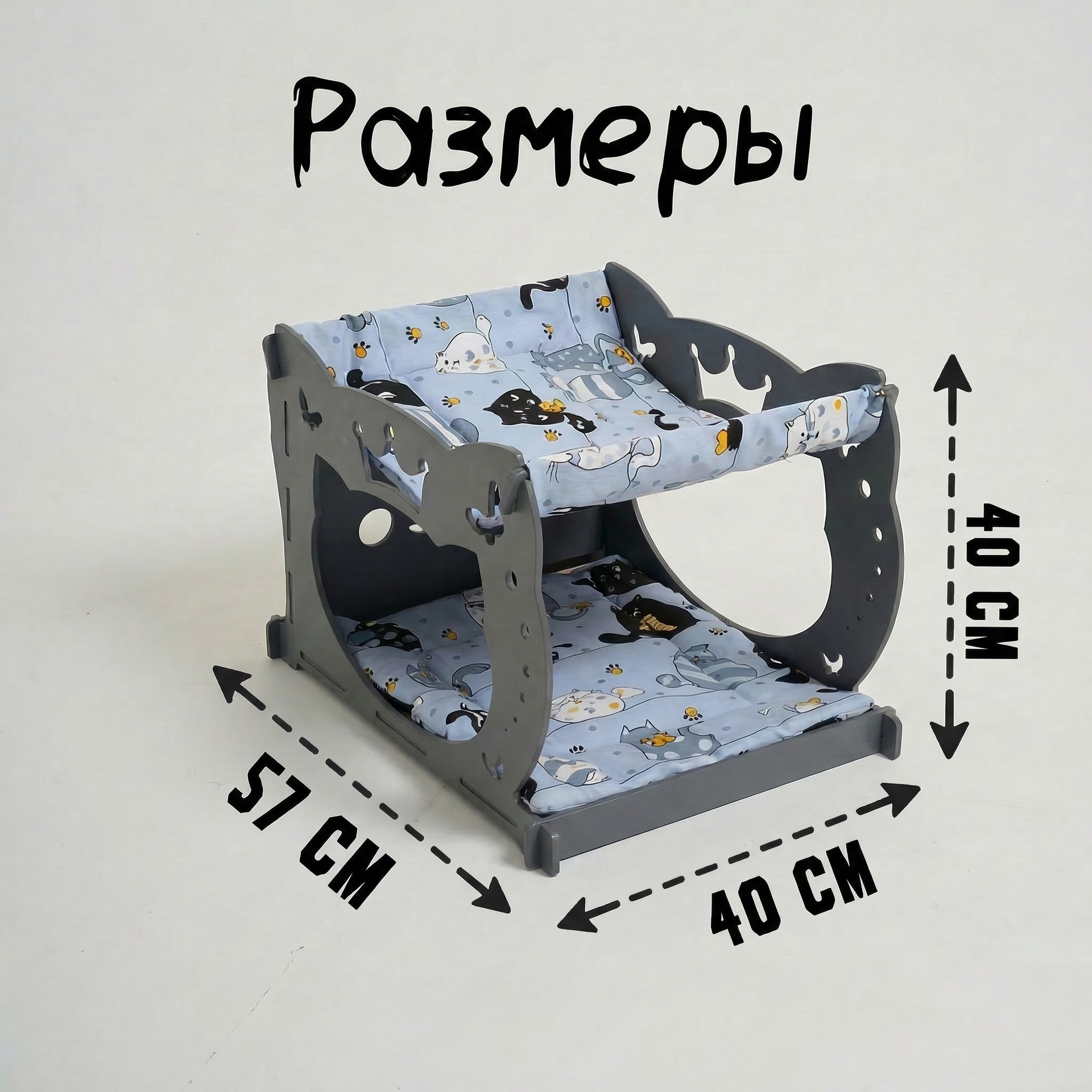 Уютный двухуровневый домик-гамак из 8 мм шлифованной фанеры, окрашен в серый цвет. Нижний ярус оснащён мягким матрасиком, верхний — подвесной гамак. Оригинальный дизайн с фигурными боковинами украсит любой интерьер.