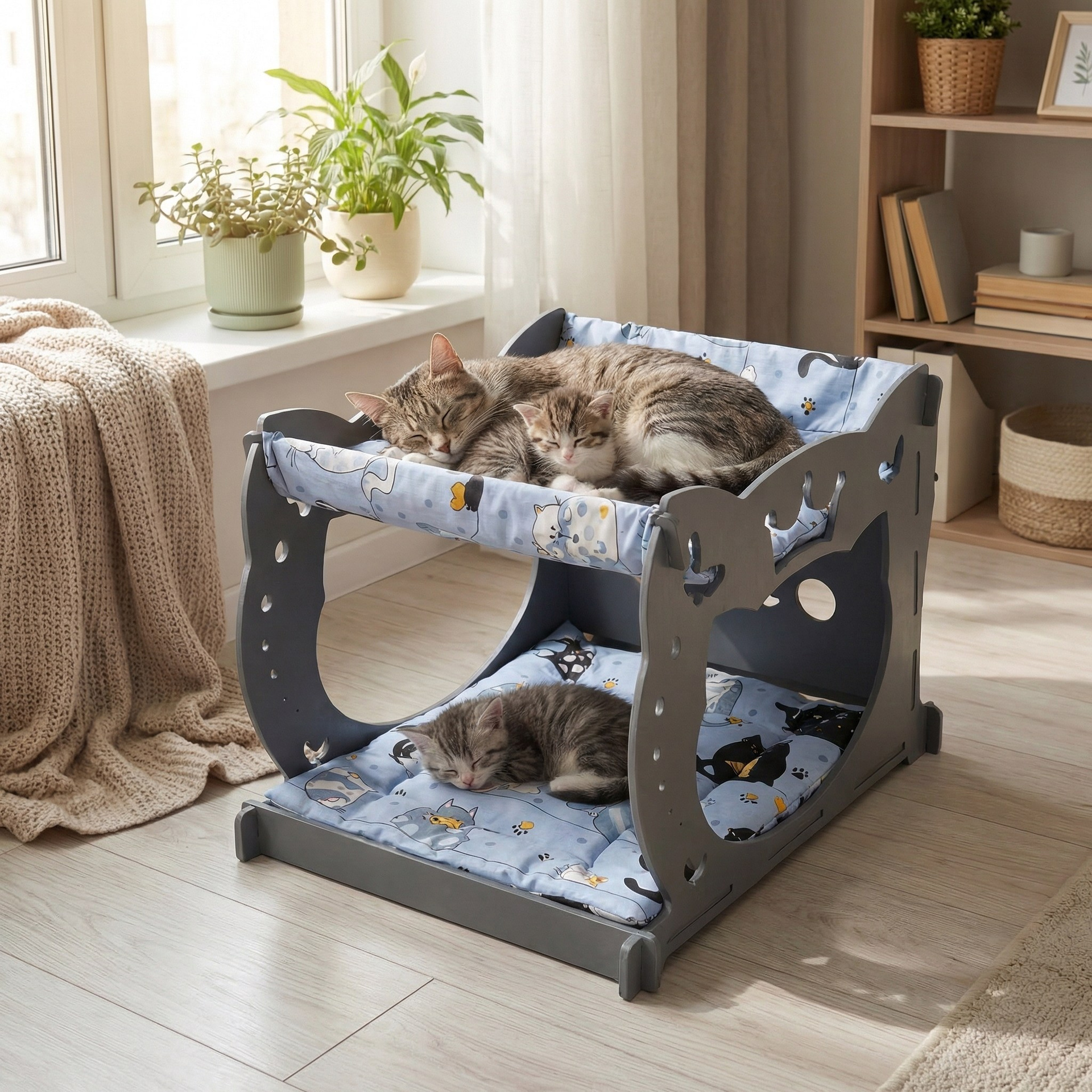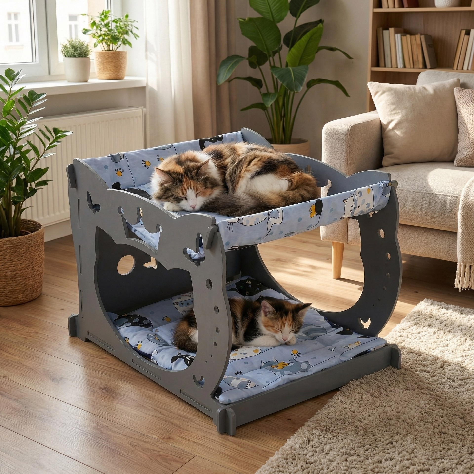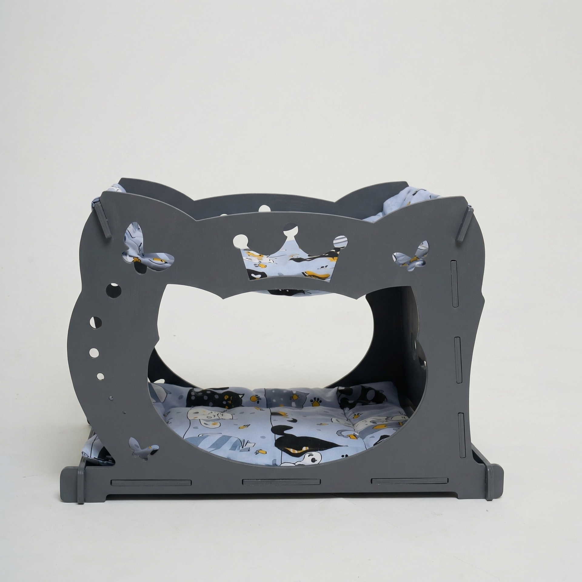 Уютный двухуровневый домик-гамак из 8 мм шлифованной фанеры, окрашен в серый цвет. Нижний ярус оснащён мягким матрасиком, верхний — подвесной гамак. Оригинальный дизайн с фигурными боковинами украсит любой интерьер.