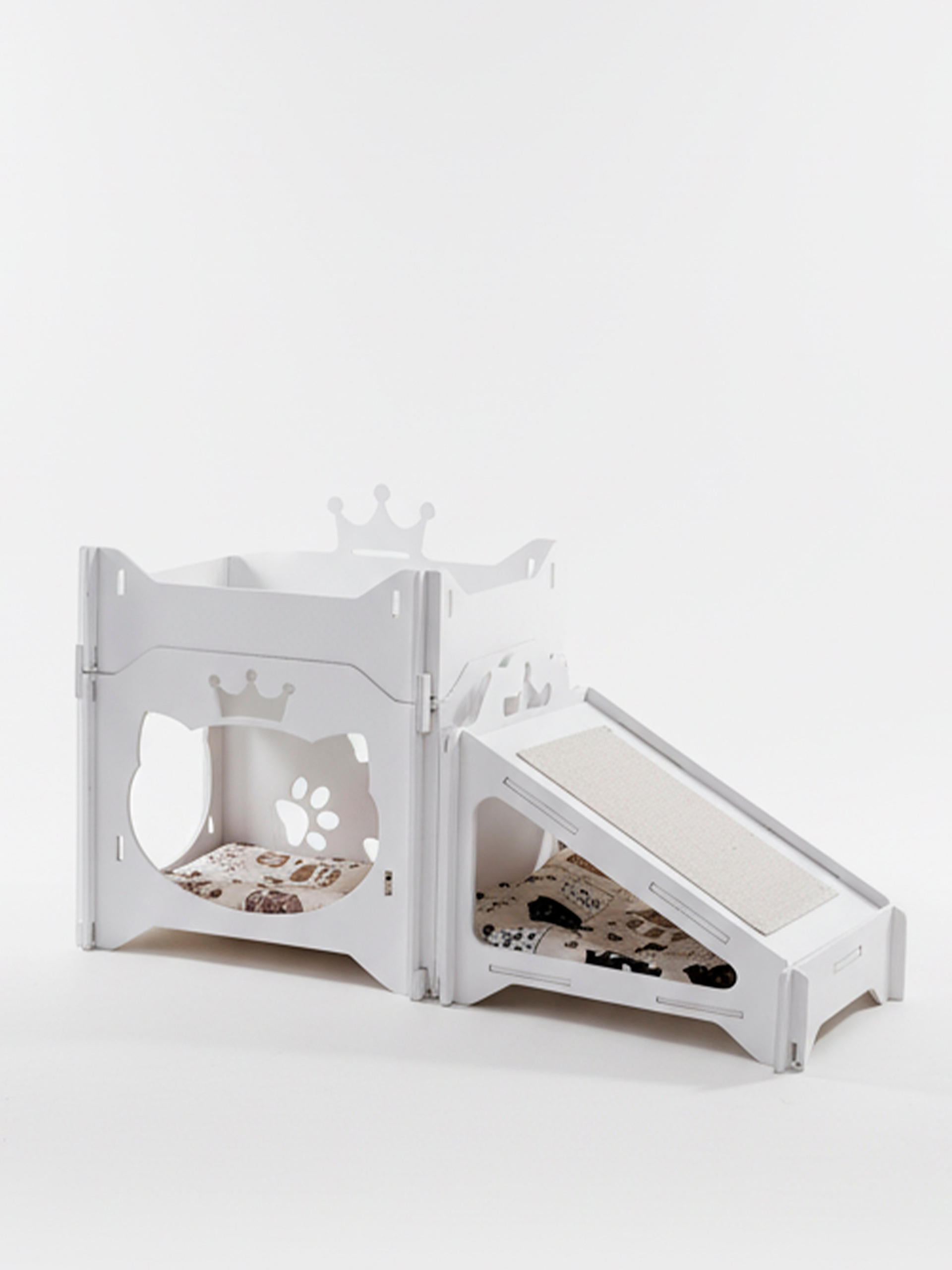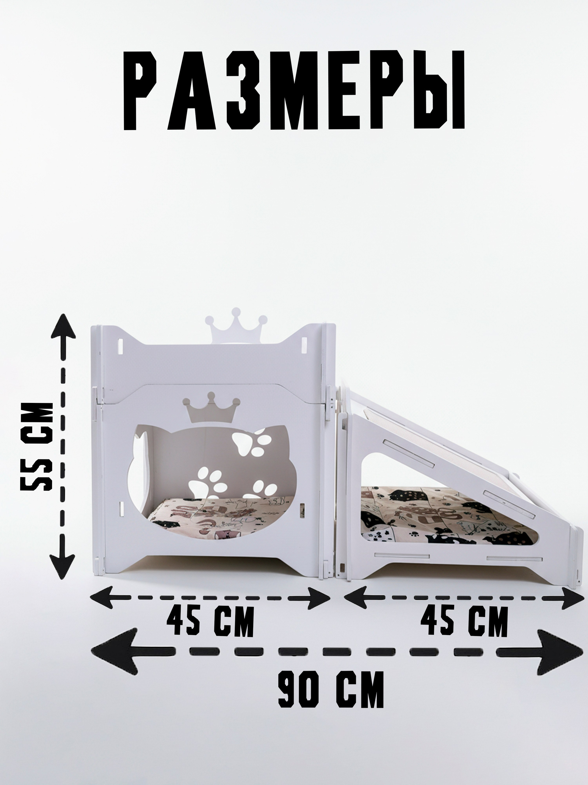 Домик для кошки выполнен из шлифованной фанеры толщиной 8 мм и окрашен в белый цвет.
