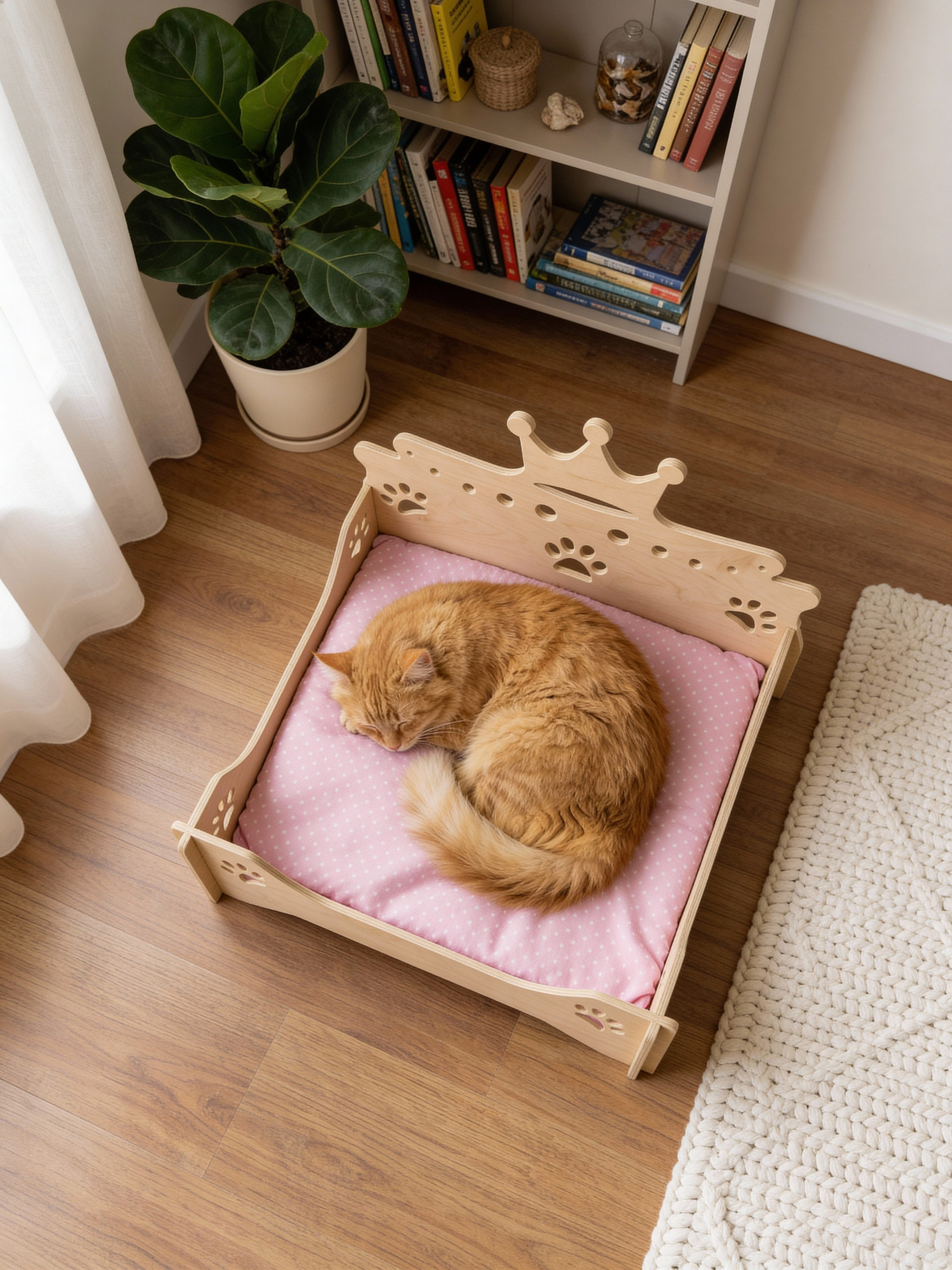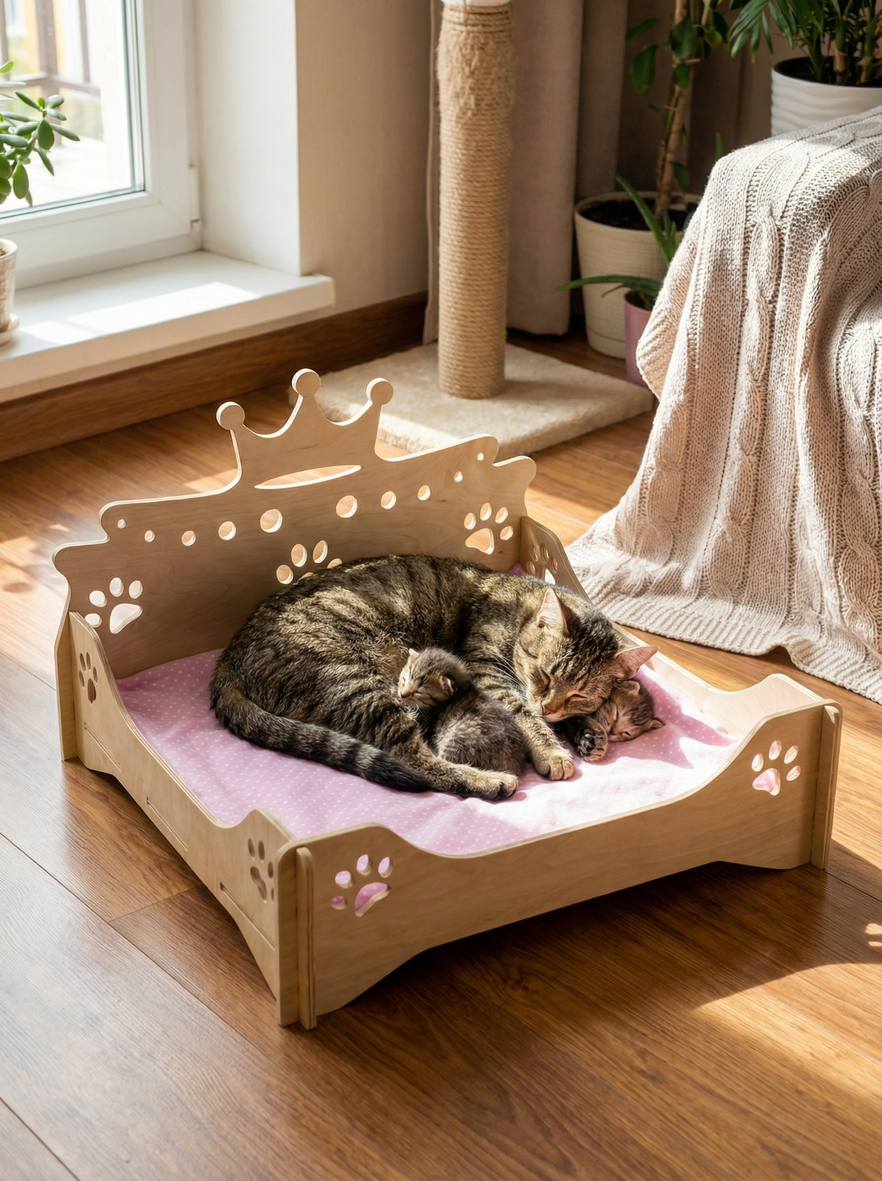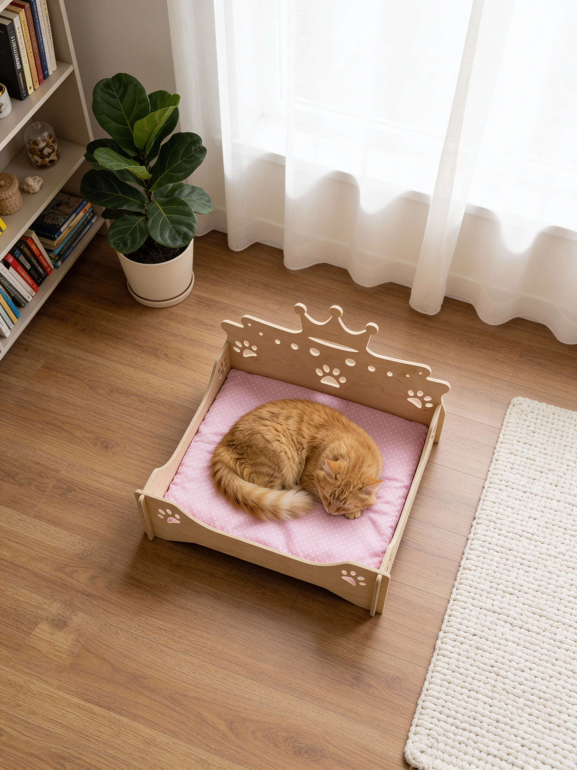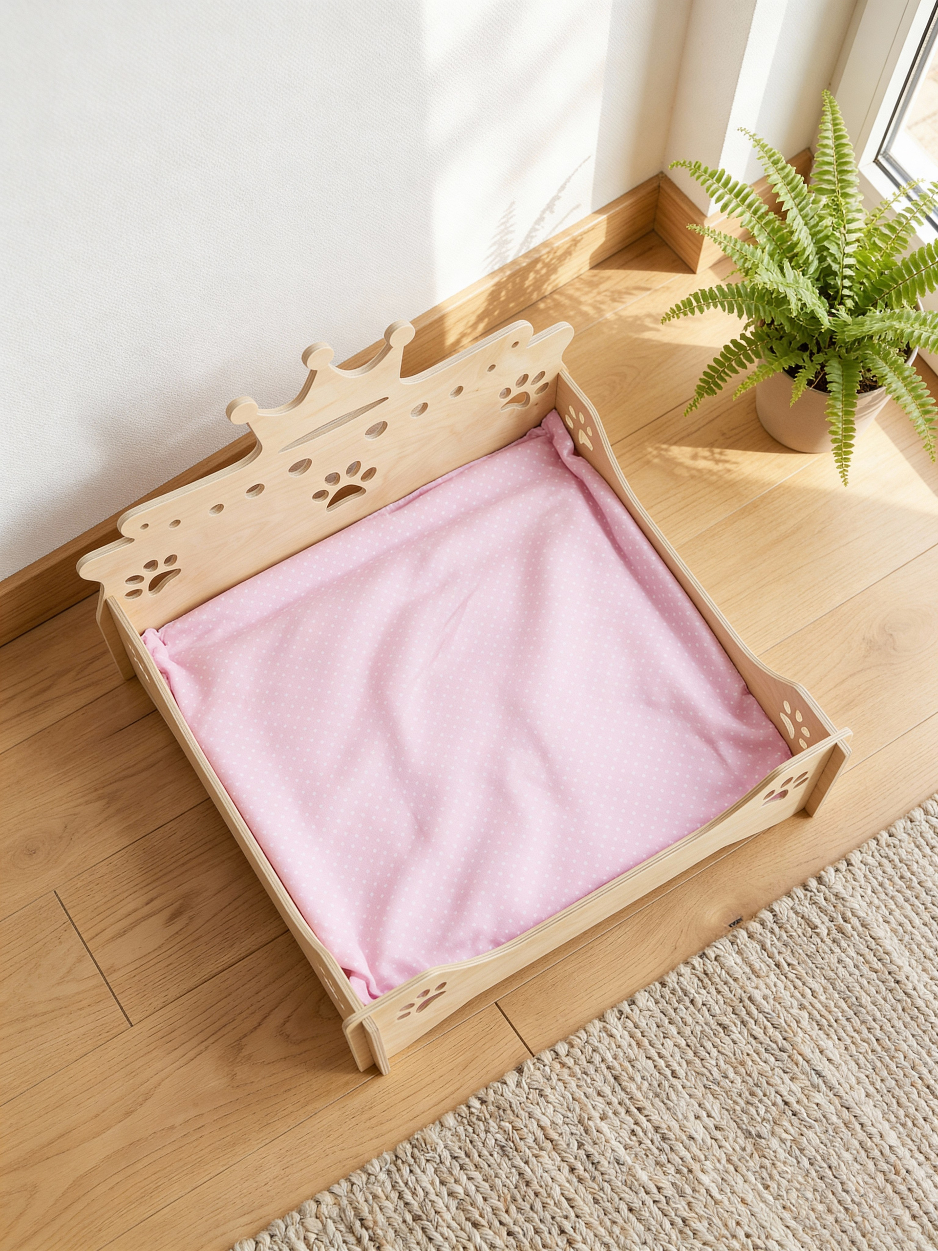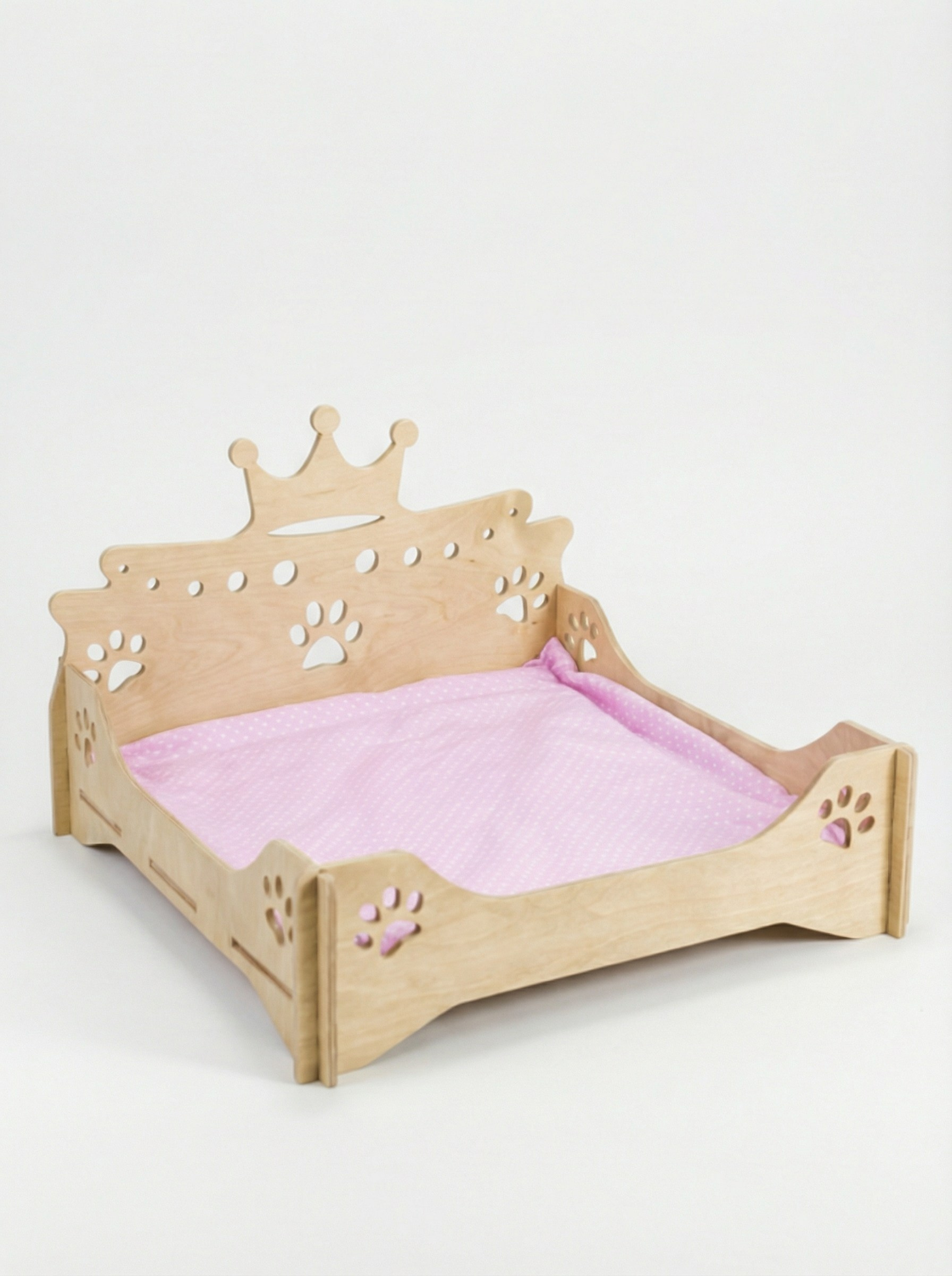 Элегантная лежанка из 8 мм шлифованной фанеры с защитной пропиткой. Изящный дизайн с короной и декоративными лапками создаёт королевское место отдыха для вашего питомца. Комплектуется съёмным мягким матрасиком на синтепоне.