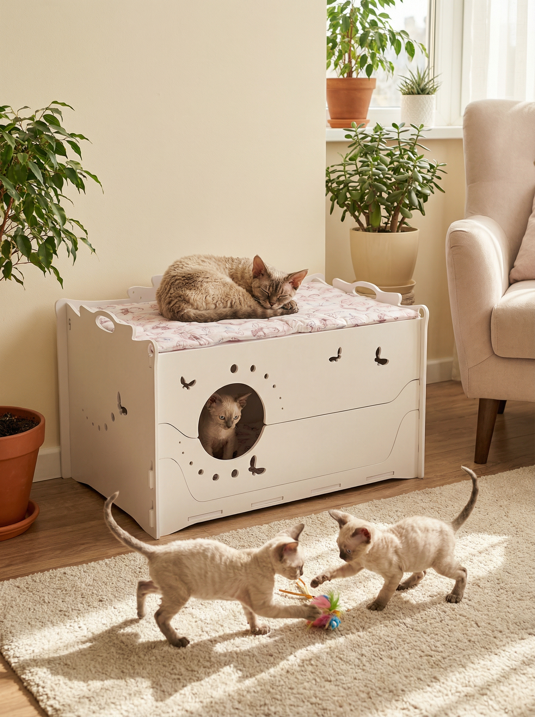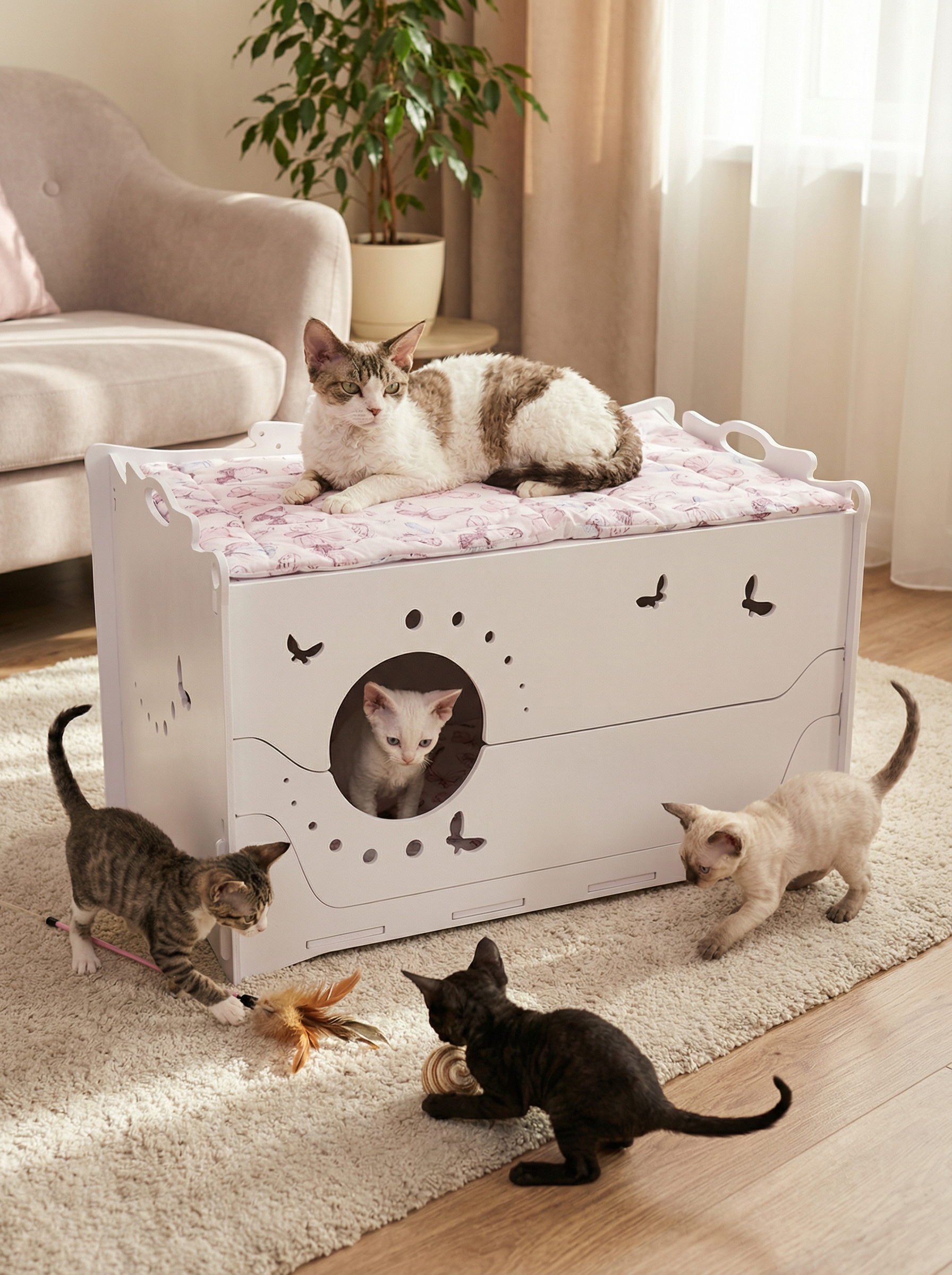 Домик-родилка для кошки в белом цвете — комфортное и безопасное место для мамы и котят.