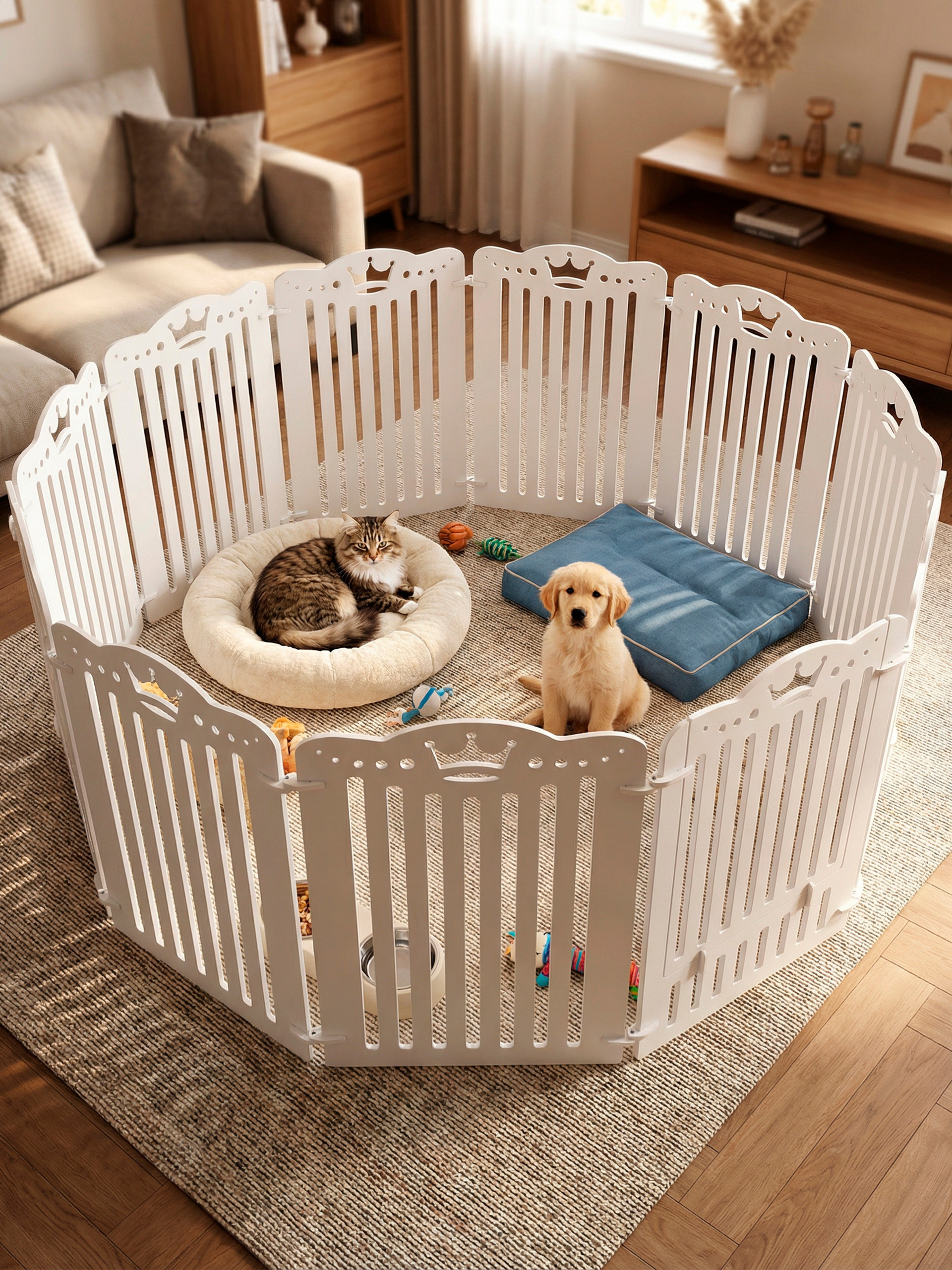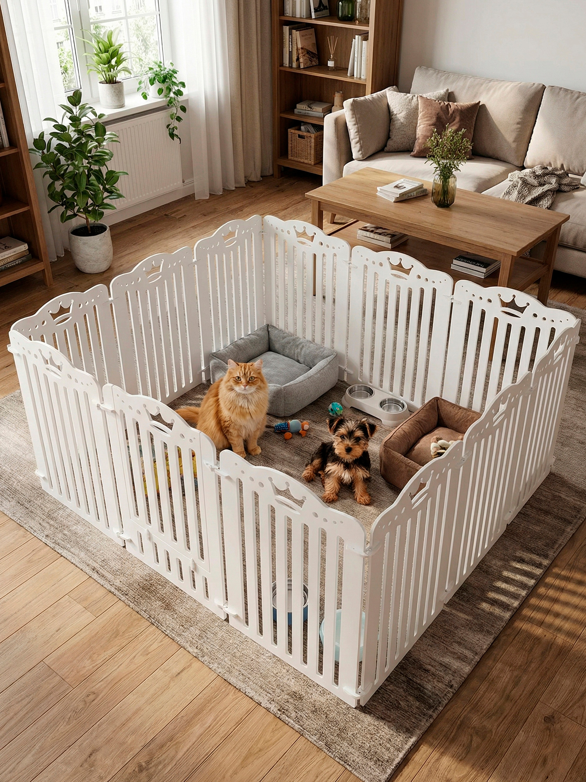 Вольер поможет создать отдельное, безопасное пространство для ваших любимцев — будь то для ухода за малышами, времен изоляции или адаптации новых питомцев в доме. Легко собирается, позволяет варьировать количество секций и подходит для любого интерьера благодаря стильному белому цвету.